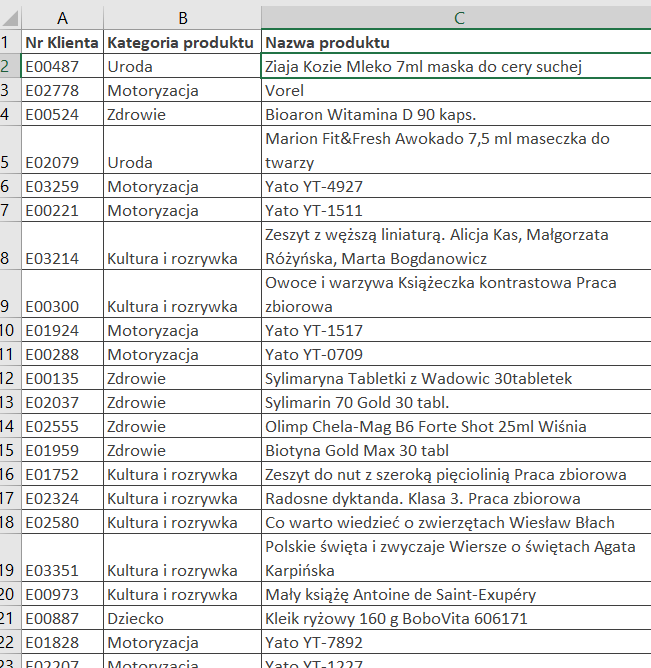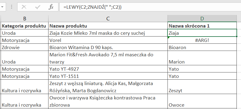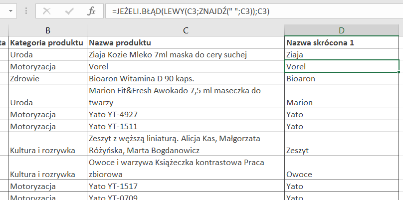 Tym sposobem mamy wyciągnięty pierwszy wyraz z każdej pełnej nazwy. Dla produktu Vorel wynikiem jest błąd, ponieważ w tej nazwie nie ma spacji. Rozwiązaniem tej chwilowej przeszkody jest dodanie do naszej formuły funkcji JEŻELI.BŁĄD: