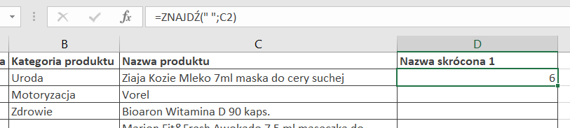 Dzięki funkcji ZNAJDŹ odnajdziemy pozycję spacji, czyli znaku oddzielającego pierwszy wyraz od drugiego.