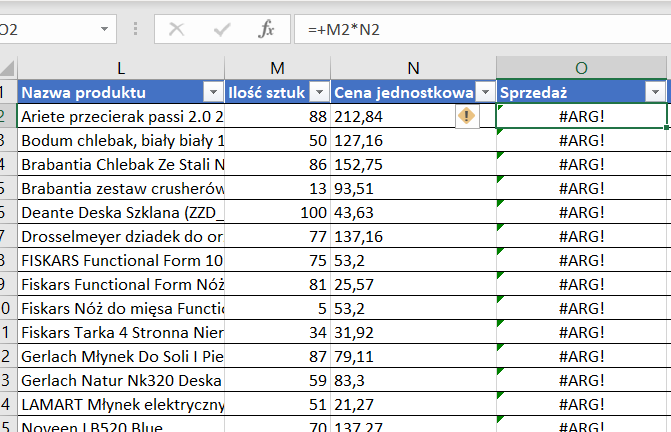 Nazwa produktu, ilość sprzedanych sztuk oraz cena została zaciągnięta z zewnętrznego systemu. W kolumnie sprzedaż jest prosta formuła obliczająca wartość sprzedaży. W moim Excelu mam ustawioną kropkę jako separator, z programu "wyskoczyły" liczby z przecinkiem, dlatego widzimy błąd #ARG!