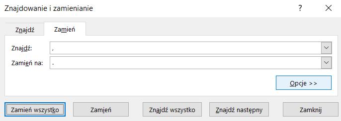 W pole Znajdź wpisujemy przecinek, w pole Zamień na kropkę. Możemy to wykonać na całym arkuszu, wybranym zakresie danych lub nawet w całym pliku (sprawdźcie Opcje).