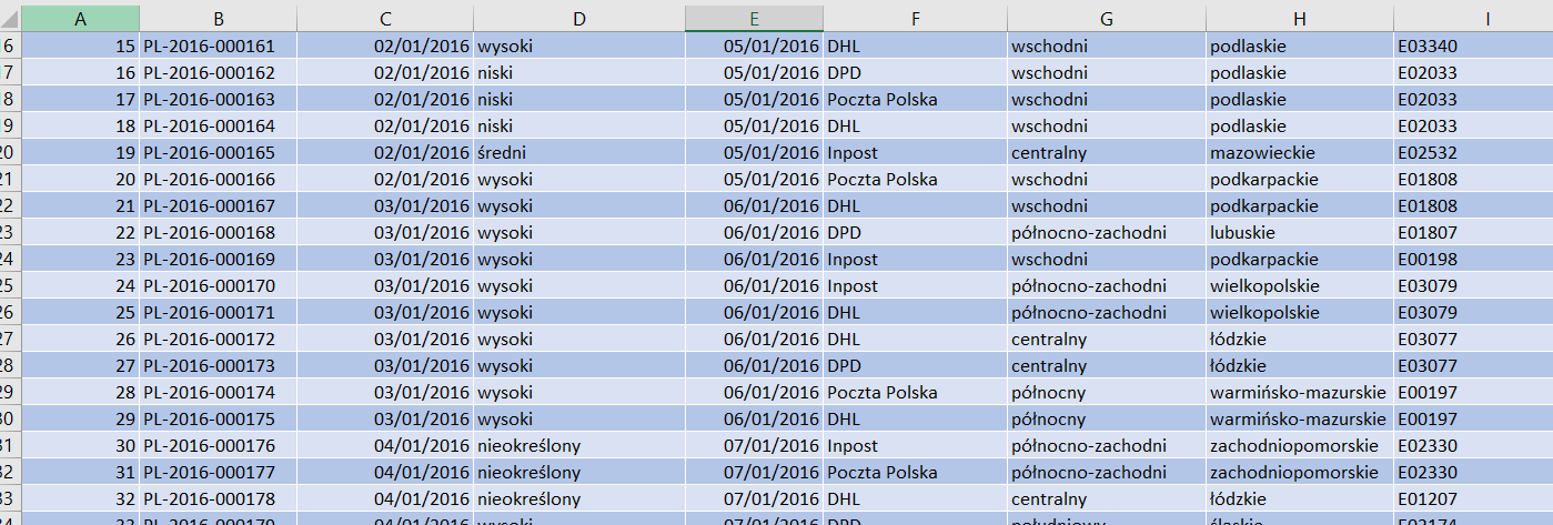 Po przesunięciu w dół o kilka wierszy nie widzimy już czy np. w kolumnie C jest data zamówienia, wysyłki, a może płatności.